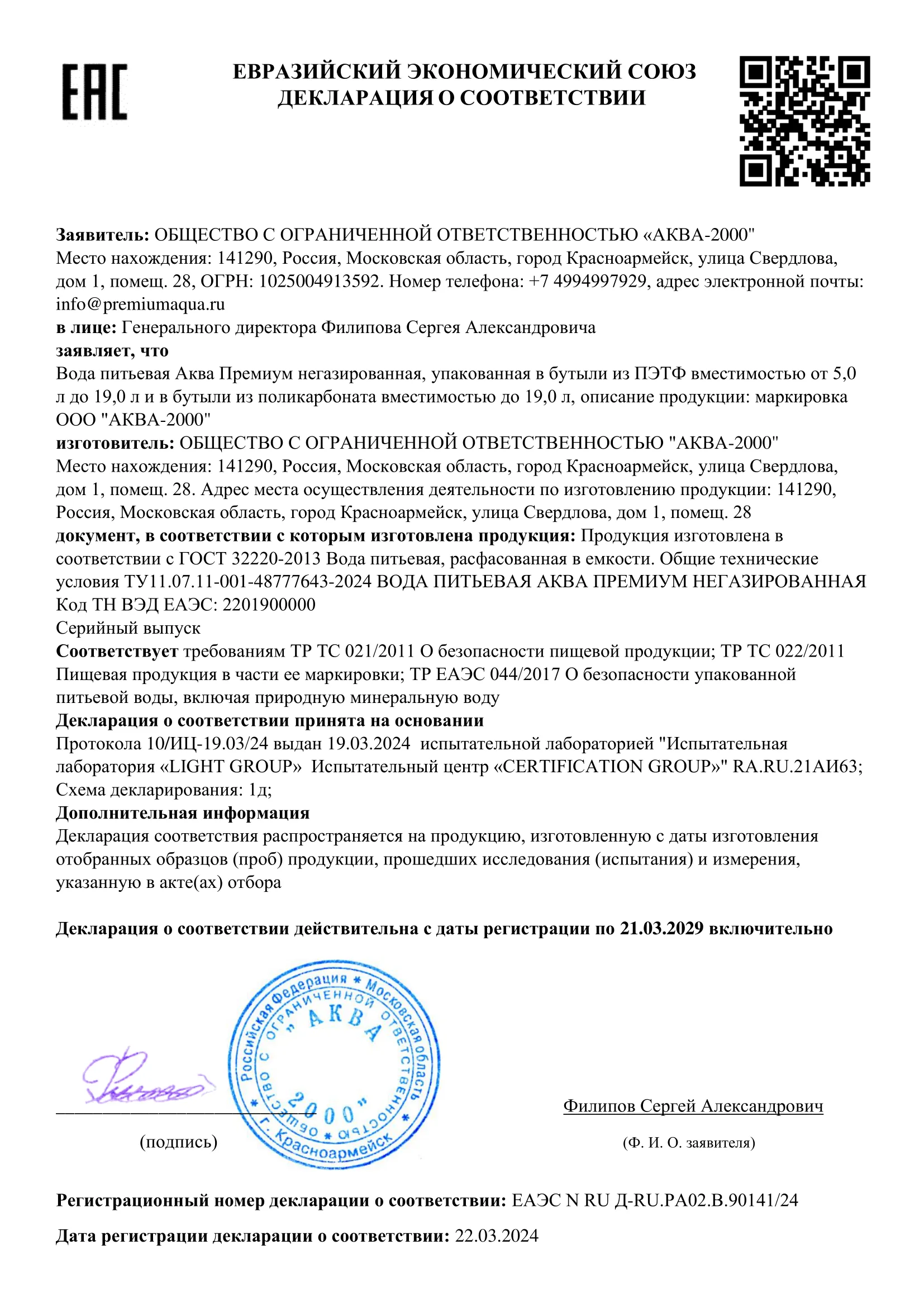 Декларация соответствия воды Аква Премиум 354 кб